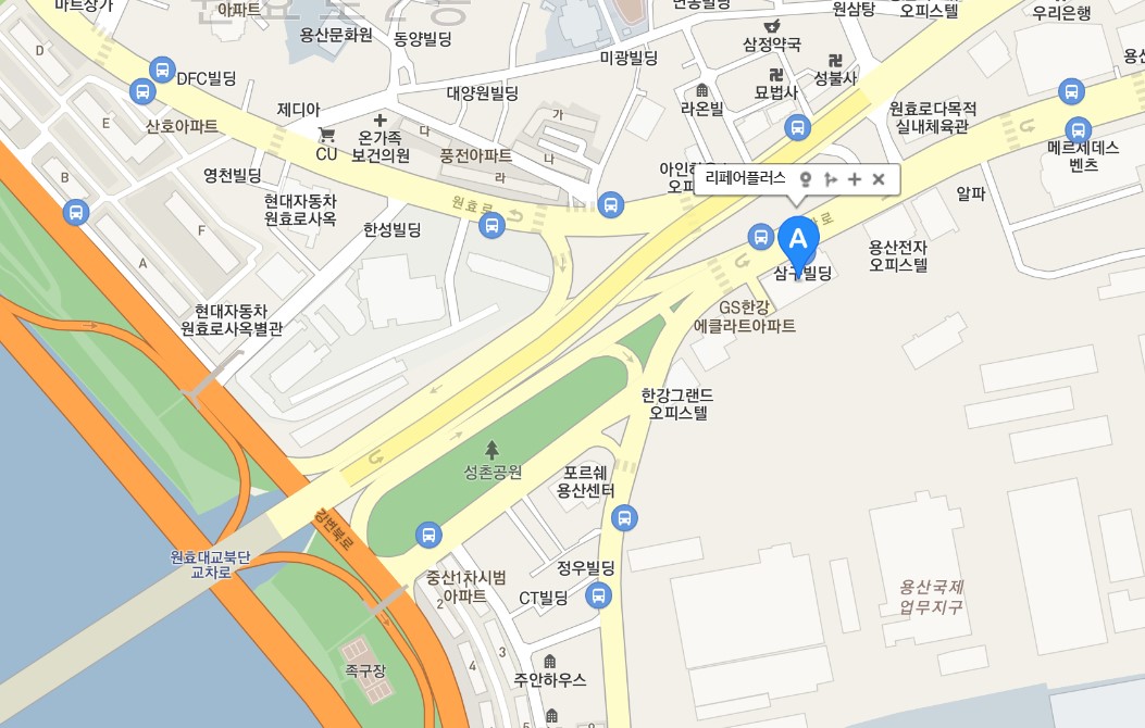 - 강변북로 (구리방향) -> 서울역/전자상가/원효로(11C) 방향 (출구) 에서 3 ~ 4km 원효대교 고가에서 유턴진입후 직진거리 100m 오른쪽 삼구빌딩 (르노자동차)